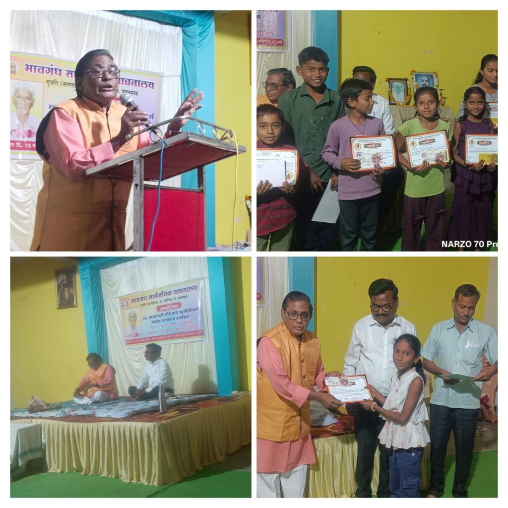 राळेगाव :- भावगंध सार्वजनिक वाचनालयाच्या वतीने दिनांक 15 /2/ 2026 रोज रविवारला हनुमान मंदिर सभागृह गुजरी येथे सायंकाळी 7.00 वाजता डॉ रवींद्र हुलके यांच्या अध्यक्षतेखाली स्व भाऊरावजी गोंडे यांचा बारावा स्मृतिदिन संपन्न. प्रथम स्वर्गीय भाऊरावजी गोंडे व तुकडोजी महाराज यांचे प्रतिमेचे पूजन मालारपण व दीप प्रज्वलन मान्यवरांचे हस्ते.कार्यक्रमाचे अध्यक्ष डॉ रवींद्र हुलके,आणि विशेष व्याख्यानकरते विनय मिरासे यांना शाल श्रीफळ पुष्पगुच्छ माननीय मधुकरराव घोटेकार यांचे हस्ते प्रदान करून स्वागत करण्यात आले . नंतर माननीय विनय मिरासे (अशांत) यवतमाळ ज्येष्ठ व्याख्याते यांचे “श्रद्धा व अंधश्रद्धा” या विषयावर व्याख्यान संपन्न.याप्रसंगी चिमुकल्या विद्यार्थ्यांनी गीत भजन तर श्री उमेशभाऊ भोयर ,श्री भगवानजी दांदडे यांनी भजन सादर केले. स्वर्गीय भाऊरावजी गोंडे यांचे 12 व्या स्मृतिदिनानिमित्त भावगंध सार्वजनिक वाचनालय गुजरी तर्फे सामान्य ज्ञान स्पर्धा तथा सुंदर हस्ताक्षर स्पर्धा शनिवारला घेण्यात आली होती.या प्रसंगी विद्यार्थ्यांना प्रमाणपत्र आणि बक्षीस प्रदान करण्यात आले त्यामध्ये प्रथम पाचशे रुपये, द्वितीय तीनशे रुपये ,तृतीय 150 रुपये ,प्रमाणे दोन गटांमध्ये प्रथम गट 5 ते 7 तर दुसरा गट 8 ते 12 स्पर्धा घेण्यात आली होती.