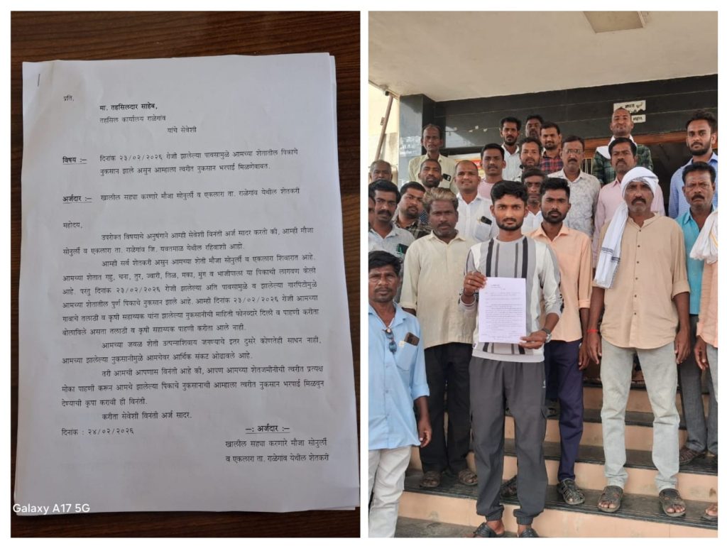 राळेगाव तालुक्यातील अनेक ठिकाणी दिनांक 23/2/2026 रोजी झालेल्या अवकाळी पावसामुळे अनेक शेतकऱ्यांचे नुकसान झाले असून यात सोनुर्ली आणि एकलाऱ्यांच्या शेतकऱ्यांच्या पिकांचे मोठ्या प्रमाणात नुकसान झाले असून सोनुर्ली आणि एकलाऱ्यांच्या शेतकऱ्यांनी 24/22026 रोजी राळेगाव तहसीलदार यांना शेतीतील पिकांचे नुकसान झाल्याचे निवेदन दिले असून शेतीतील झालेल्या नुकसानीची पाहणी करण्यासाठी तलाठी, कृषी सहायक यांना भ्रमणध्वनीवरून दिली असता कुणीही झालेले नुकसान पाहण्यासाठी आले नसल्याचे निवेदनातून म्हटले असून गहू, हरभरा, ज्वारी,तुर तीळ, मक्का ,मुंग इत्यादी शेती मालाचे शेतकऱ्यांच्या हातातून उत्पन्न निघून गेले असल्याने शेतकऱ्यांवर आर्थिक संकटाचा सामना करावा लागणार आहे.करीता संबंधित विभागाने मोका पाहणी करून शेतकऱ्यांना नुकसानभरपाई मिळवून देण्यासाठी शासनस्तरावर कार्यवाही करण्यात यावी या मागणीसाठी खालील शेतकऱ्यांनी तहसीलदार यांना निवेदन सादर केले आहेत अशी माहिती त्यांनी प्रसिद्धी पत्रकाद्वारे दिली आहे.