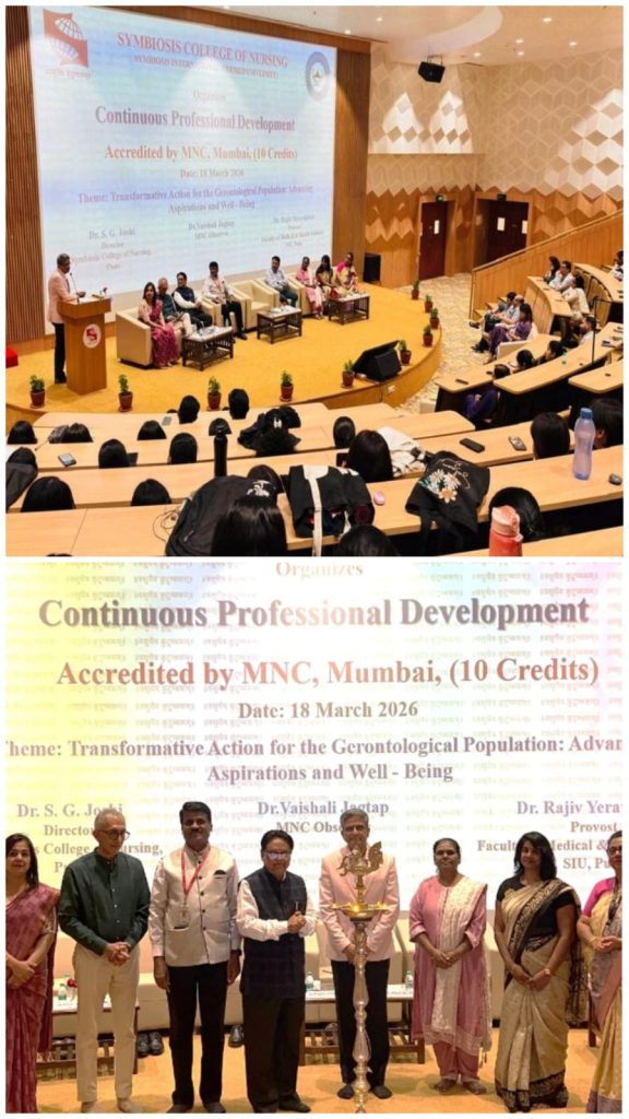 सिम्बायोसिस आंतरराष्ट्रीय विद्यापीठ अंतर्गत सिम्बायोसिस कॉलेज ऑफ नर्सिंगच्या कम्युनिटी हेल्थ नर्सिंग विभागातर्फे परिचारिकांसाठी “वृद्धावस्था काळजी” या अत्यंत महत्त्वपूर्ण विषयावर सातत्यपूर्ण व्यावसायिक विकास (CPD) कार्यक्रमाचे यशस्वी आयोजन करण्यात आले. समाजात वाढत्या वृद्ध लोकसंख्येच्या पार्श्वभूमीवर त्यांच्या सर्वांगीण आरोग्यसेवेसाठी परिचारिकांना सक्षम करण्याचा हा उपक्रम प्रेरणादायी ठरला.