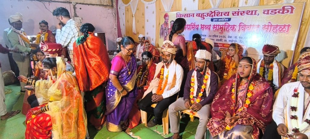राळेगाव ग्रामीण :राळेगाव तालुक्यातील वडकी येथील इंगोले सभागृहात किसान बहुउद्देशीय संस्थेच्या वतीने आयोजित सर्व धर्मीय भव्य सामूहिक विवाह मेळावा मोठ्या उत्साहात आणि जल्लोषात पार पडला. या सोहळ्यात एकूण १४ जोडप्यांचे विवाह सामाजिक एकात्मतेचा संदेश देत विधीपूर्वक संपन्न झाले.