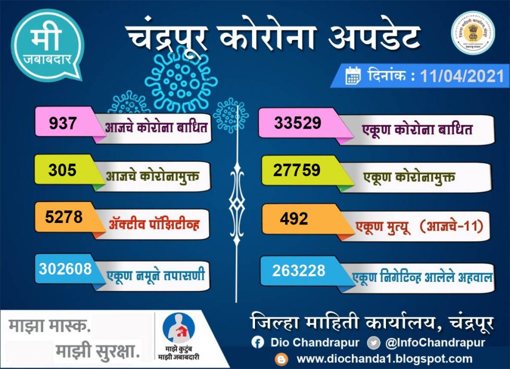 चंद्रपूर, दि. 11 एप्रिल : जिल्ह्यात मागील 24 तासात 305 जणांनी कोरोनावर मात केल्याने त्यांना रुग्णालयातून सुटी देण्यात आली आहे, तर 937 कोरोनाबाधीत रुग्णांची नव्याने भर पडली असून 11 बाधीतांचा मृत्यू झाला आहे.