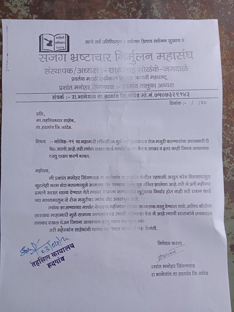 त्यांनी आपल्या निवेदनात म्हटले आहे की,कोरना च्या सध्य परिस्थितीत मोल मजुरी करनारे नागरीकांचे काम बंद असून त्यांना आर्थिक समस्यांना तोंड द्यावे लागत आहे.त्यातच किराणा मालाच्या किमती भरमसाठ वाढल्याने मजुर व सामान्य नागरिक यांच्या पुढे खाण्या पिण्याचा प्रश्न निर्माण झाला आहे. तरी आपन या सर्व परस्थितीचा विचार. करून रेशन कार्डवर इतर साहित्या बरोबरच साखर,तेल व डाळीचे देखील वाटप तात्काळ करण्याची सोय करावी.असे प्रशांत सिंगनवाड यांनी मागणी केली आहे.