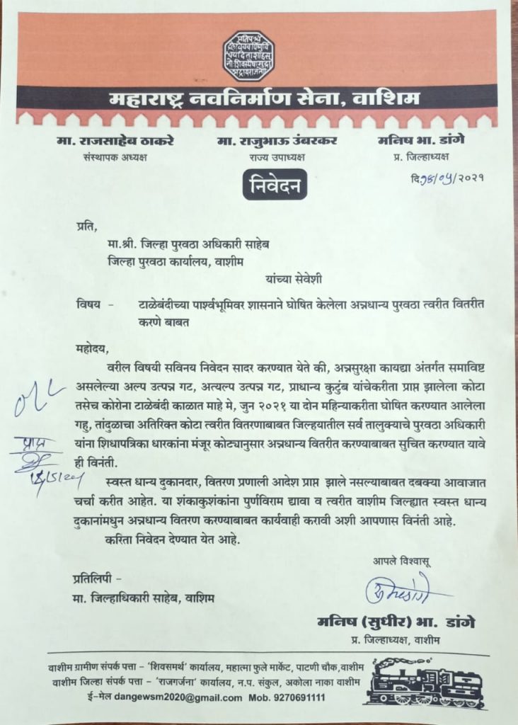 दिनांक 14-05-2021 रोजी महाराष्ट्र नवनिर्माण सेनेच्या वतीने टाळेबंदीच्या पाश्वभूमी शासनाने घोषित केलेल्या अन्नधान्य पुरवठा त्वरित वितरित करणे बाबत यांना महाराष्ट्र नवनिर्माण सेनेचे प्रभारी जिल्हाध्यक्ष मनीष भा. डांगे यांच्या नेतृत्वात निवेदन देण्यात आले