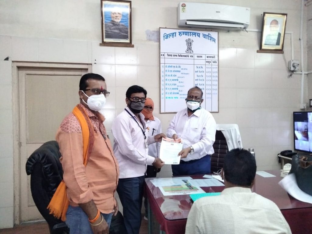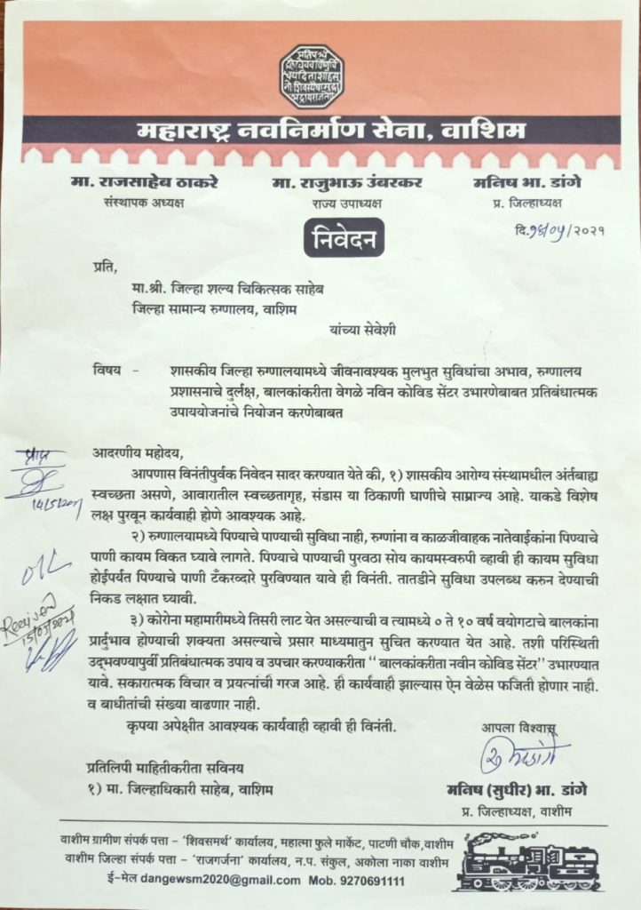 जिल्हा रुग्णालयामध्ये जीवनावश्यक मुलभूत सुविधांचा अभाव, रुग्णालय प्रशासनाचे दुर्लक्ष, बालकांकरिता वेगळे नविन कोविड सेंटर उभारणे बाबत प्रतिबंधात्मक उपाययोजनांचे नियोजन करणे बाबत निवेदन प्रभारी जिल्हा अध्यक्ष मनिष डांगे यांनी दिले यावेळी गजानन गिरी, किशोर गजरे, गजानन वैरागडे, प्रतिक कांबळे, मोहन कोल्हे महेश कदम मयूर दाभाडे आदी होते